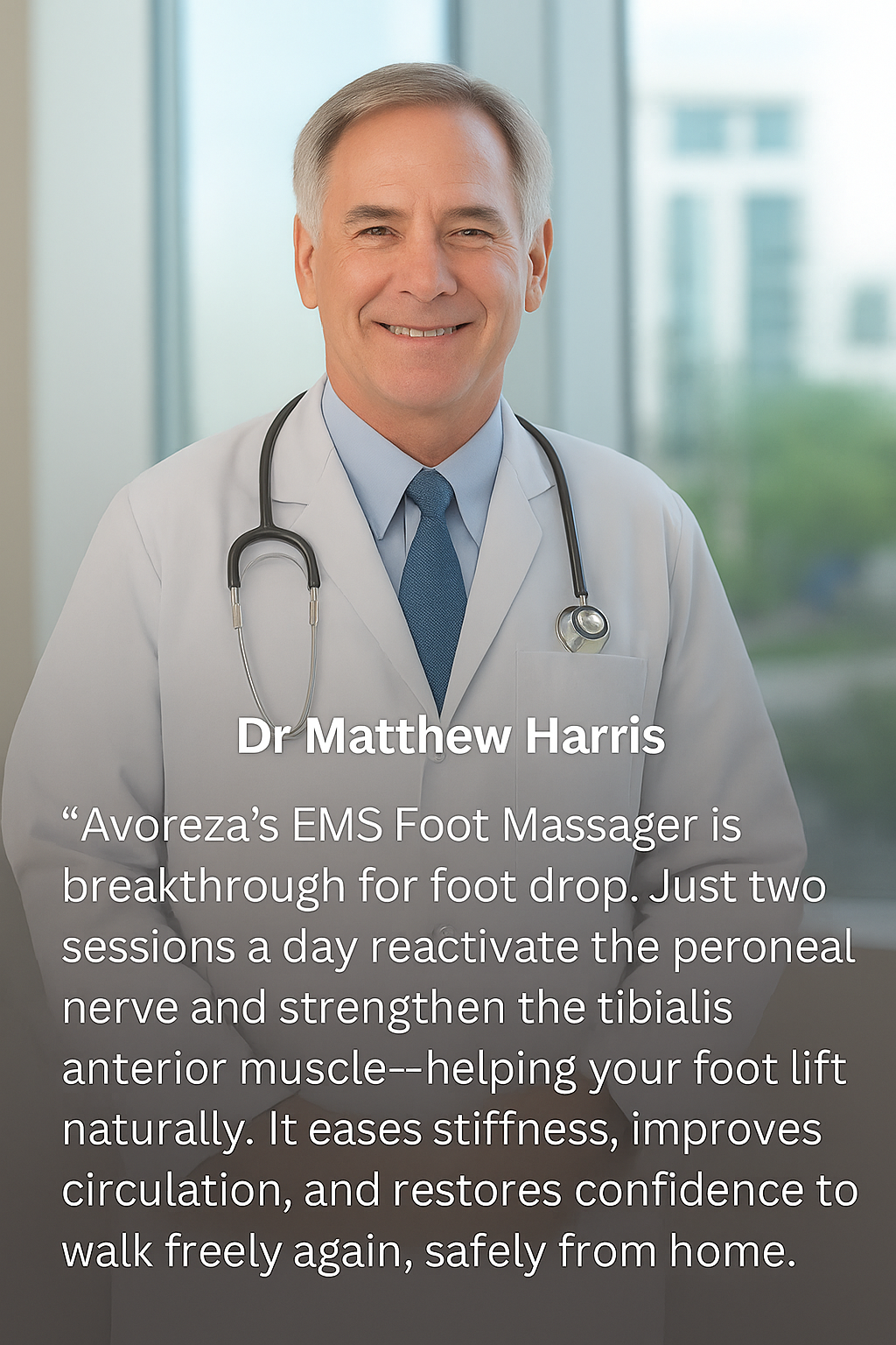Avoreza uses gentle EMS pulses to wake up the muscles and nerves that lift your foot. It strengthens the weak areas caused by stroke so you can walk better — all without braces, pills, or painful treatments.